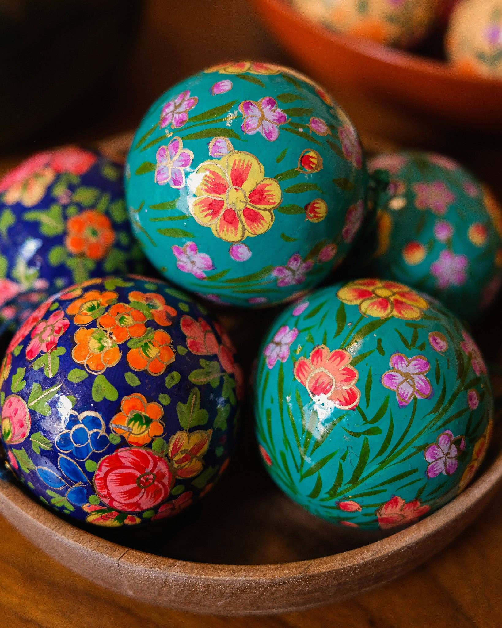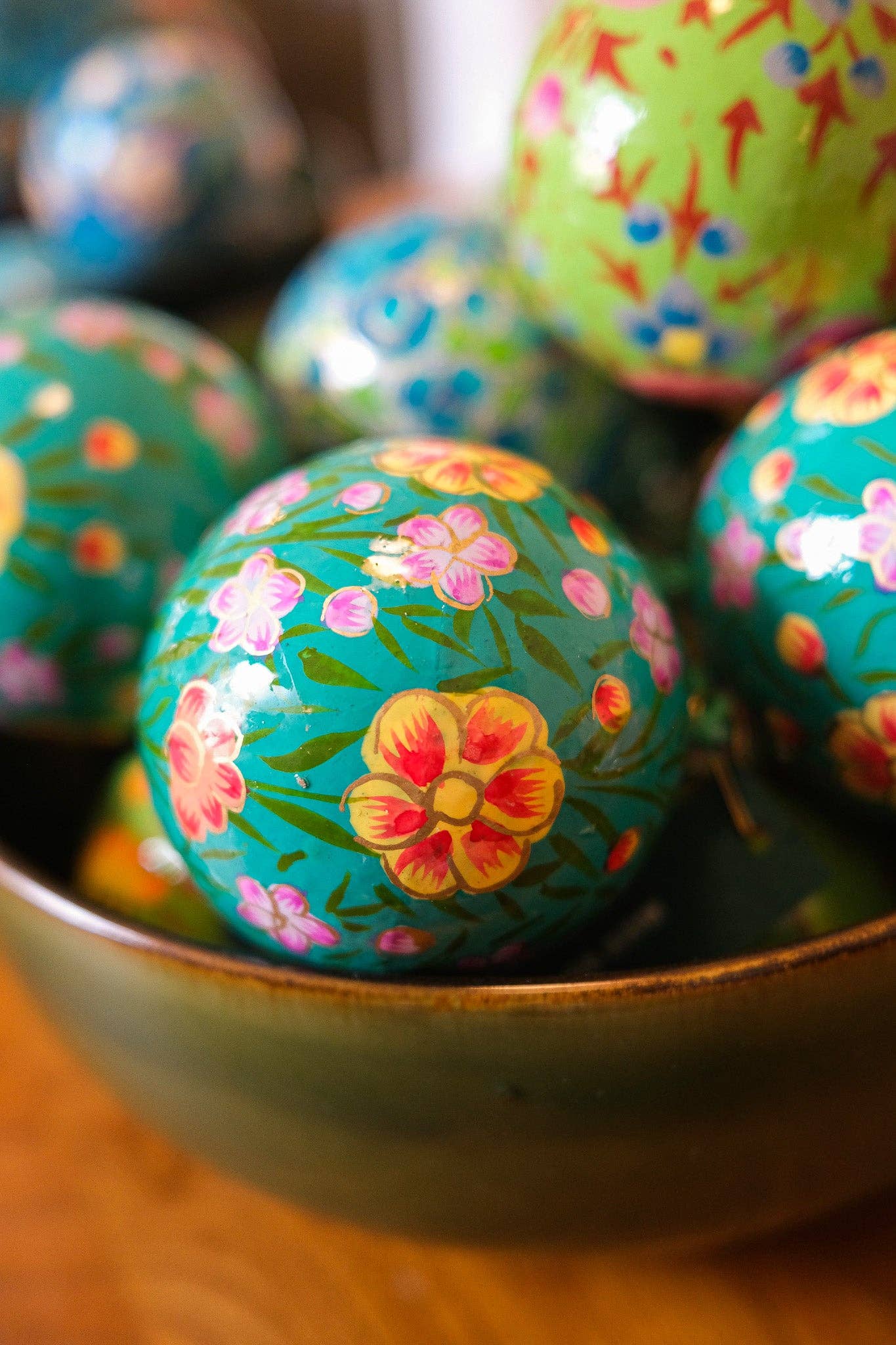 These beautiful baubles are all made from papier mâché recycled paper, hand-painted with intricate, colourful designs, and have a soft velvet thread hanging loop.