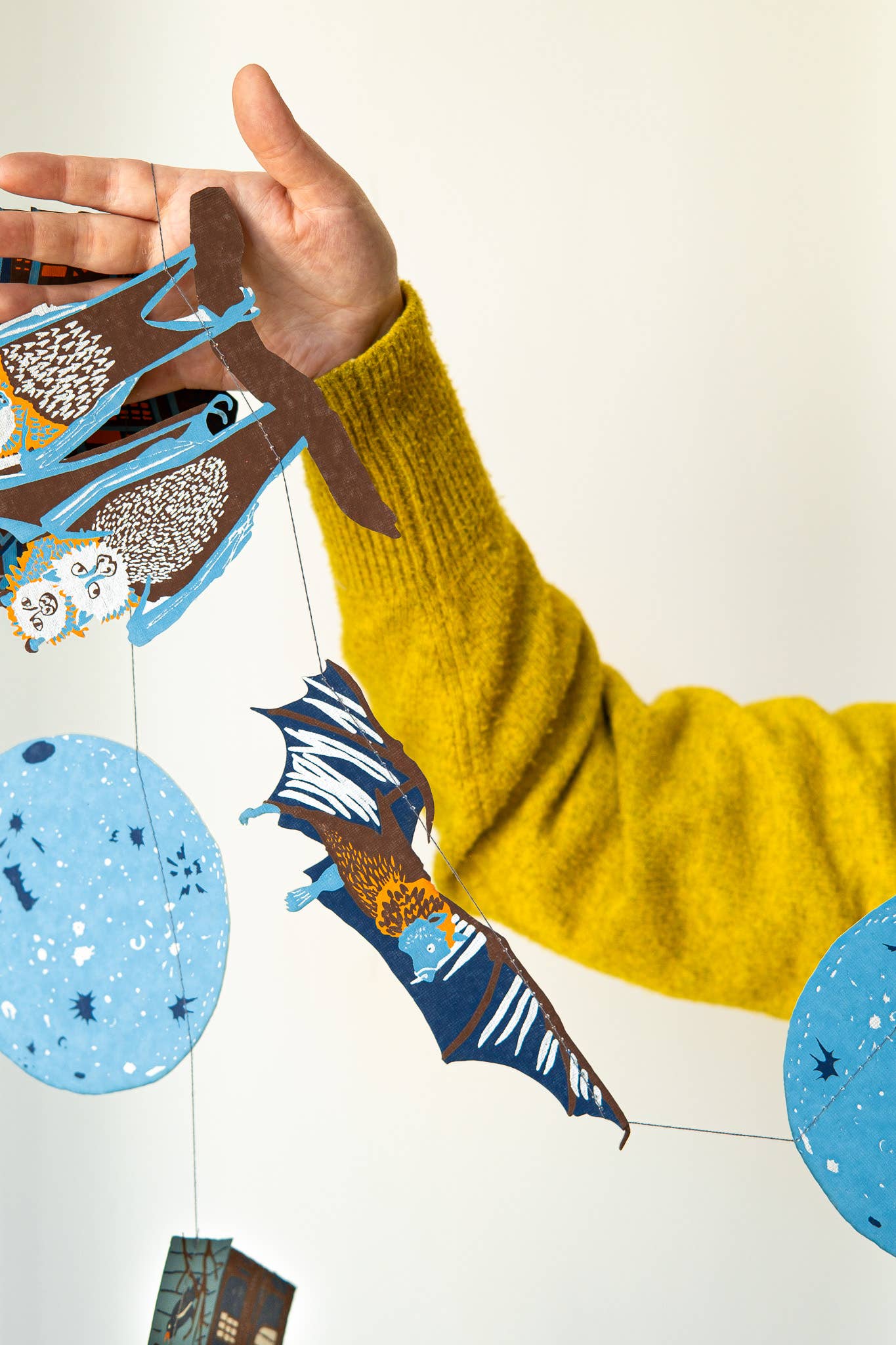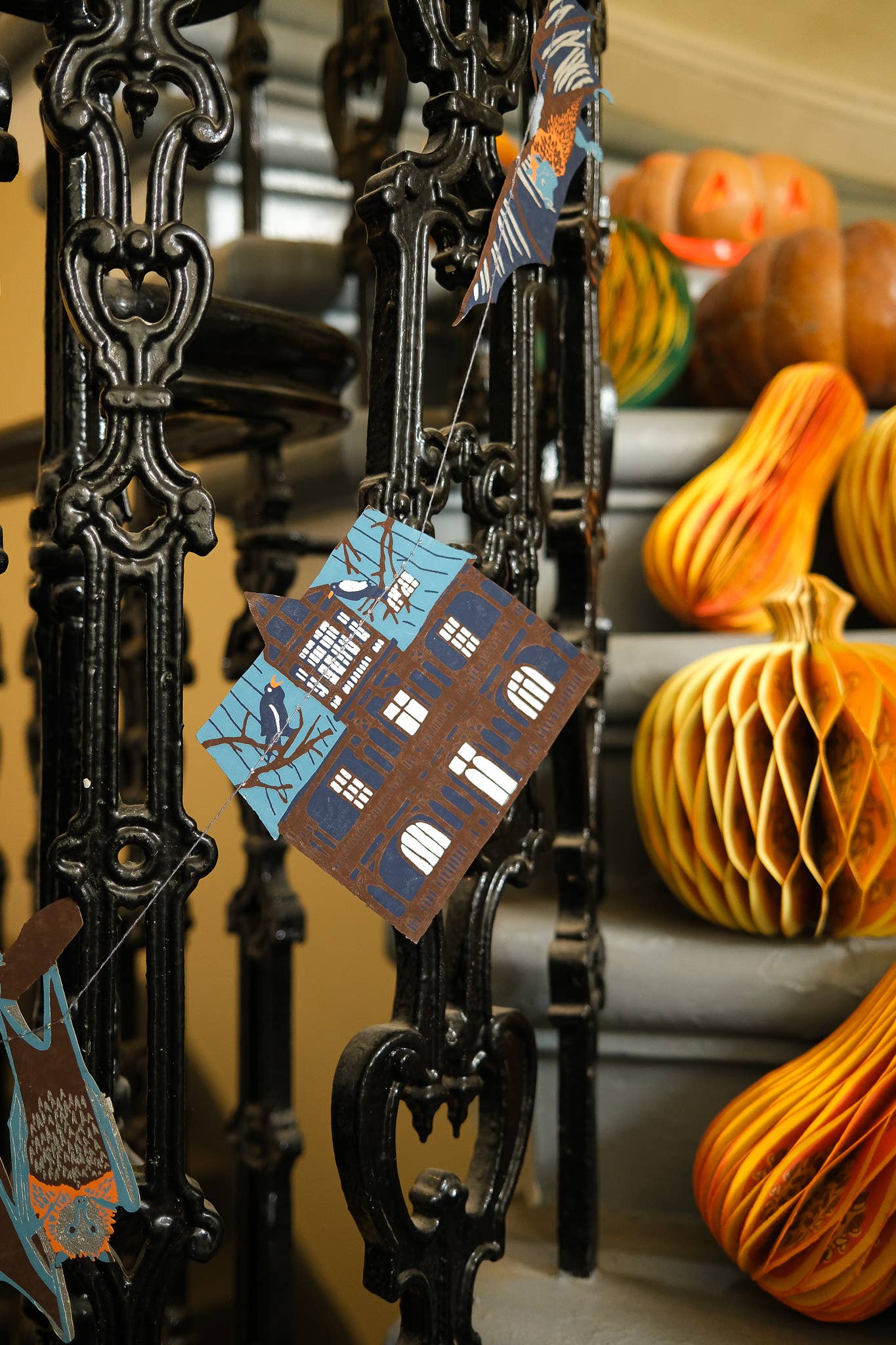 Ten haunted houses, moons and bats are spread along this three metre garland, perfect for adding some spookiness to your Halloween decor! Made from 100% recycled content paper.
