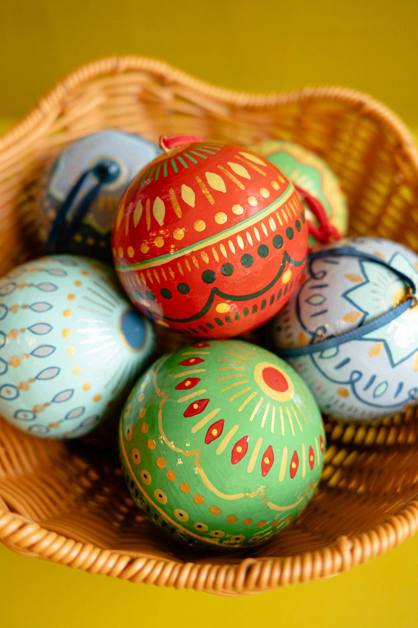 These beautiful baubles are all made from papier mâché recycled paper, hand-painted with intricate, colourful illustrations, and have a soft velvet hanging loop.