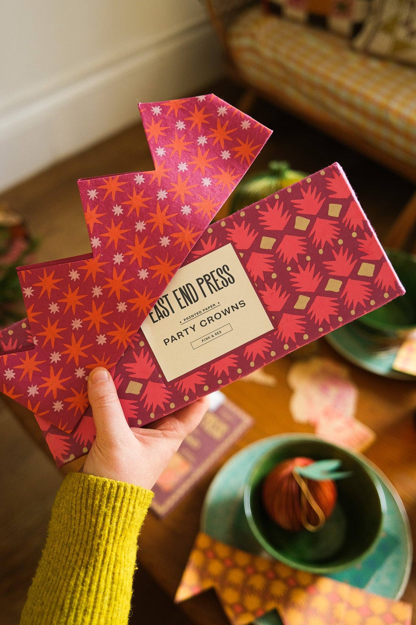 Our colourful party crowns are each screen printed by hand with a different pattern onto recycled paper. Each crown is slightly different, but all are shades of pink. They are sturdy enough to be packed away and reused celebration after celebration. The crowns are large enough for adult heads, and perfect for adding some fun to your party!