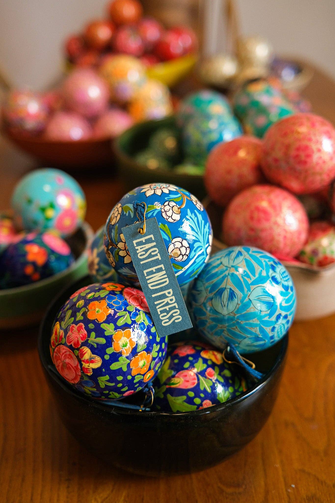 These beautiful baubles are all made from papier mâché recycled paper, hand-painted with intricate, colourful designs, and have a soft velvet thread hanging loop.